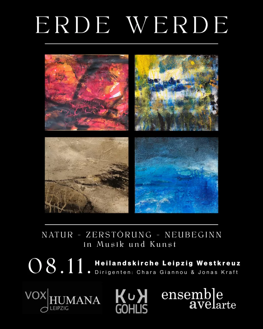 Der Erde eine Sprache geben, in Musik, Dichtung, Gemälden und Skulpturen. Unter dem Motto “Natur - Zerstörung - Neubeginn” setzen sich die Kammerchöre Vox Humana und Ensemble Avelarte gemeinsam mit dem Verein Kunst und Kultur Gohlis künstlerisch mit diesem Thema auseinander und wollen in einer von Umweltzerstörung, Klimaerwärmung, Krieg und gesellschaft-lichen Unruhen bedrohten Welt auf dessen existentielle Bedeutung aufmerksam machen. In einer einmaligen Verbindung von Kunstausstellung und performativem Konzert ist dies am 08.11. in der Leipziger Heilandskirche - WESTKREUZ zu erleben.